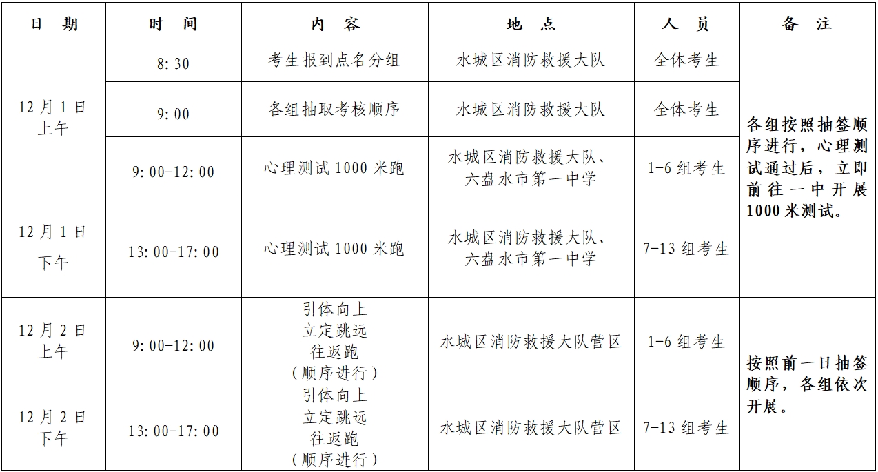 3.簽到要求:所有進(jìn)入測試人員需攜帶本人身份證原件在2024年12月1日上午8:30分到達(dá)水城區(qū)消防救援大隊進(jìn)行簽到,2024年12月1日上午9:00未按時到達(dá)并簽到的,視為自動放棄后續(xù)測試。