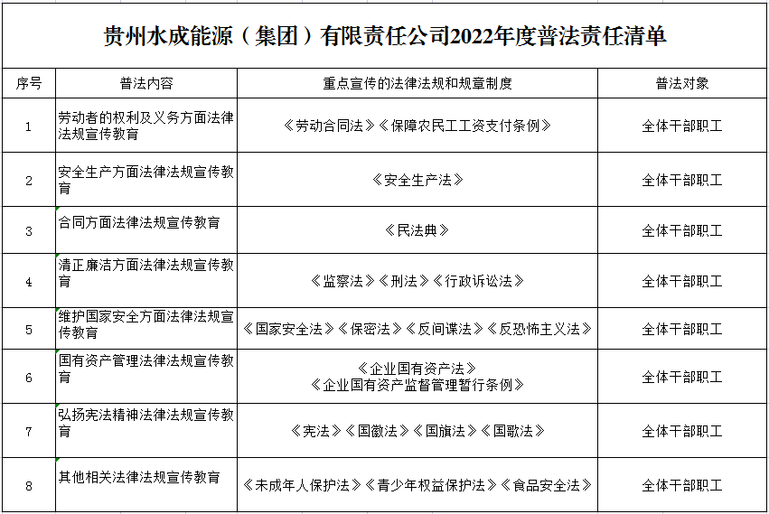 貴州水成能源集團有限責(zé)任公司2022年度普法責(zé)任清單